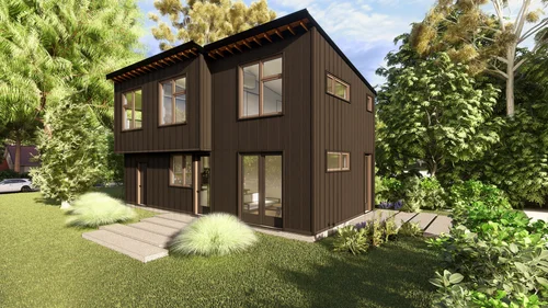 The design is under the height limit and can fit on standard to small lots, around trees, or on sloped lots, with space for adjacent parking if desired. The cottage can be oriented toward the principal residence for multi-generational living around a courtyard. The front door is on the corner and can be placed on either the short or long side of the design, depending on site orientation.